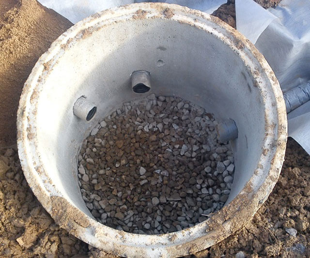 Конструкции поглотительного типа отличаются тем, что они представляют собой дренажный колодец без дна. Вместо него оборудуют фильтрующую «подушку», пропускающую сточную грязную жидкость и очищающую ее от мусора. Далее вода направляется в глубокие слои почвы. Глубина залегания такого колодца в грунт должна составлять не меньше двух метров, а толщина фильтрующей подушки – минимум 30 сантиметров.