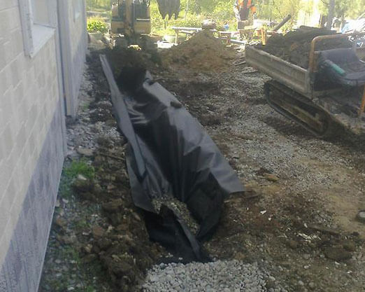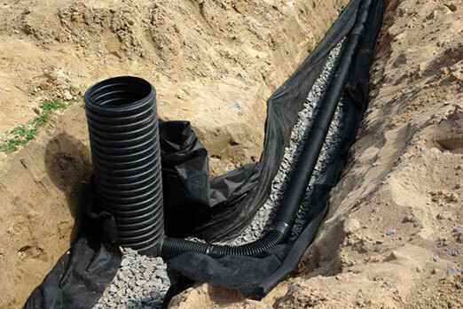 Завершив подготовительные работы, можно начинать закладку трубопровода. Все трубы должны в процессе выполнения работ оказаться завернутыми в такой материал для дренажной системы, как геотекстильная ткань, которая обеспечивает фильтрацию. Диаметр дренажных труб обычно составляет 63 мм, а водоотводных – 110 мм. Заворачивать трубы в геотекстиль можно как предварительно, так и уложив их в канавы, для чего используется метод нахлеста. Стыки труб желательно тоже завернуть в ткань и промазать герметиком. Такая закрытая система сможет работать много лет без малейших нареканий.