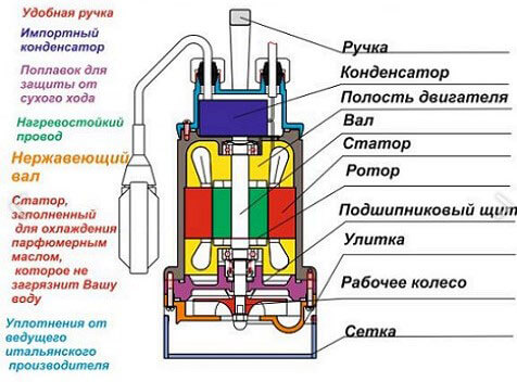 - поплавковый выключатель – служит для отключения и включения аппарата в автоматическом режиме. Данное устройство контролирует уровень жидкости в колодце или емкости, обеспечивая защиту механизма от «сухого хода». Оно отвечает за своевременное включение аппарата.