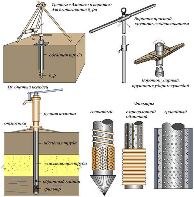 С помощью скважины иглы можно преодолеть только начальные водоносные горизонты, находящиеся у поверхности. Как следствие, полученная таким образом вода обычно применяется в технических целях – полив огорода, уборка территории, замешивание различных строительных растворов и т.п. Чтобы довести качество воды до возможности использования ее для питья и готовки еды, в состав колонны вводят систему грубых и тонких фильтров, которые очищают воду от различных механических и химических примесей.