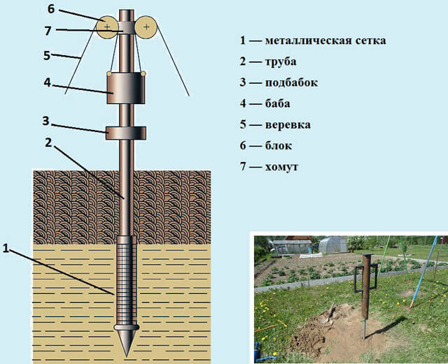 - Копер. Комплексный элемент, включающий металлический треножник и тяжелую болванку (она выполняет функцию ударника). Треножник в верхней точке оснащен парой блоков, через которые протянуты веревки, на них висит болванка.