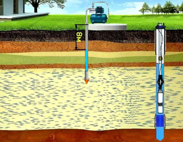 Некоторые модели поверхностных насосов по документам способны поднимать воду на высоту 10 м. Однако важно помнить об обычных потерях давления внутри шахты и о том, что часть транспортируемой воды уходит в горизонтальном направлении. В пересчете на высоту, каждые 10 м такого участка отнимают у глубины всасывания 1 м. Кроме того, согласно инструкции, поверхностные помпы должны устанавливаться в закрытых помещениях (а это еще дополнительное расстояние от точки водозабора).