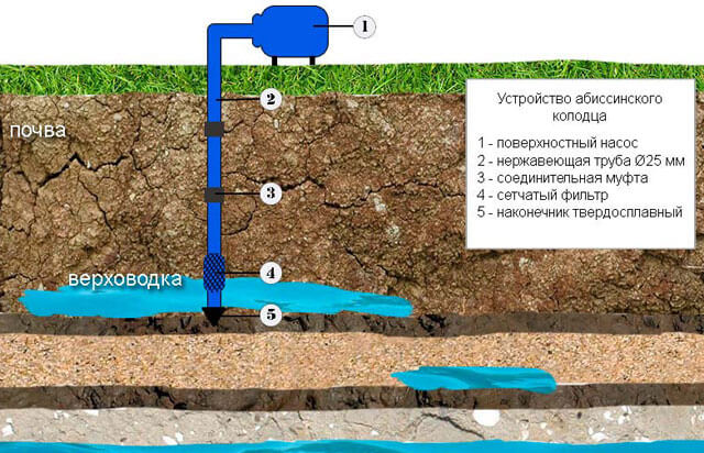 Абиссинский колодец является упрощенной разновидностью скважины, которая извлекает воду из проходящего сверху первого или второго водоносного горизонта. Устроена абиссинская скважина очень просто. Главным элементом конструкции является колонна с набором газоводопроводных труб из стали, которые соединены между собой. На конце колонны имеется простейший фильтр и металлическая насадка. Выработка внешне очень похожа на известный инструмент портного – иглу. Ее так и называют – скважина игла.