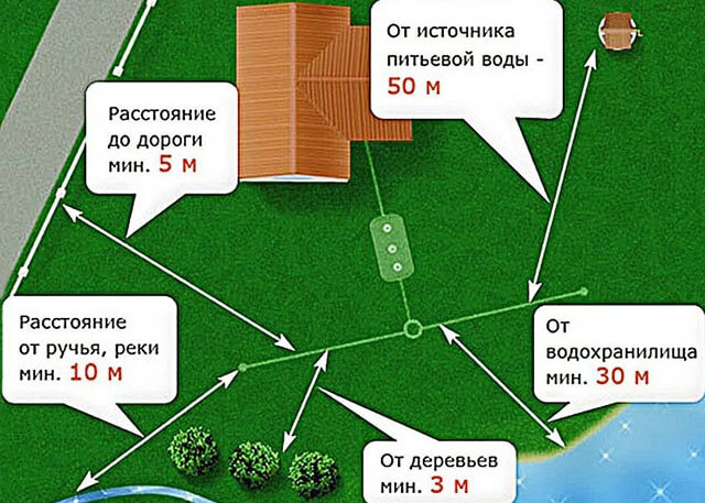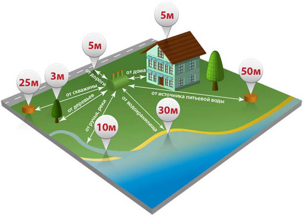 В обоих случаях при строительстве сливной ямы или септика следует принимать во внимание нормы СанПиН, согласно которым расстояние от емкости, предназначенной для сбора стоков и нечистот до близко расположенных объектов, зависит от состава почвы. Например, промежуток между септиком и колодцем или скважиной должен составлять для глинистых грунтов — 25 — 30 метров, а для супесчаных и песчаных — минимум 50 метров.