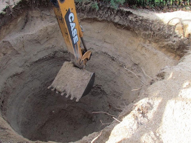 При обустройстве дачной канализации без откачки своими руками в определенном месте, предусмотренном в проекте, c применением лопат и лебедки или мини-экскаватора выкапывают яму, имеющую глубину, равную высоте 2-3 колец и горловины.