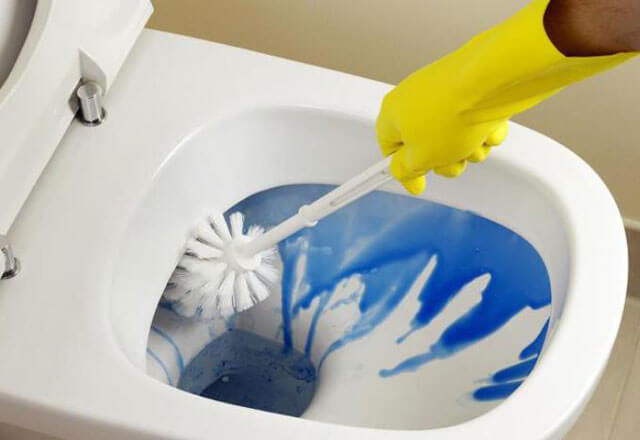 При использовании соляной кислоты следует проявлять особую осторожность и аккуратность, чтобы не допустить попадания средства на кожу рук и в дыхательные пути. Поэтому перед тем как удалить водный камень в унитазе нужно надеть перчатки и защитную маску. Применение жидкости достаточно простое, необходимо облить составом чашу унитаза, стараясь захватить максимальную площадь, и потереть ершиком. По истечении 20 минут загрязнение вновь протирают и смывают водой. Очень важно знать, что для пластиковых сточных труб это средство не подходит.